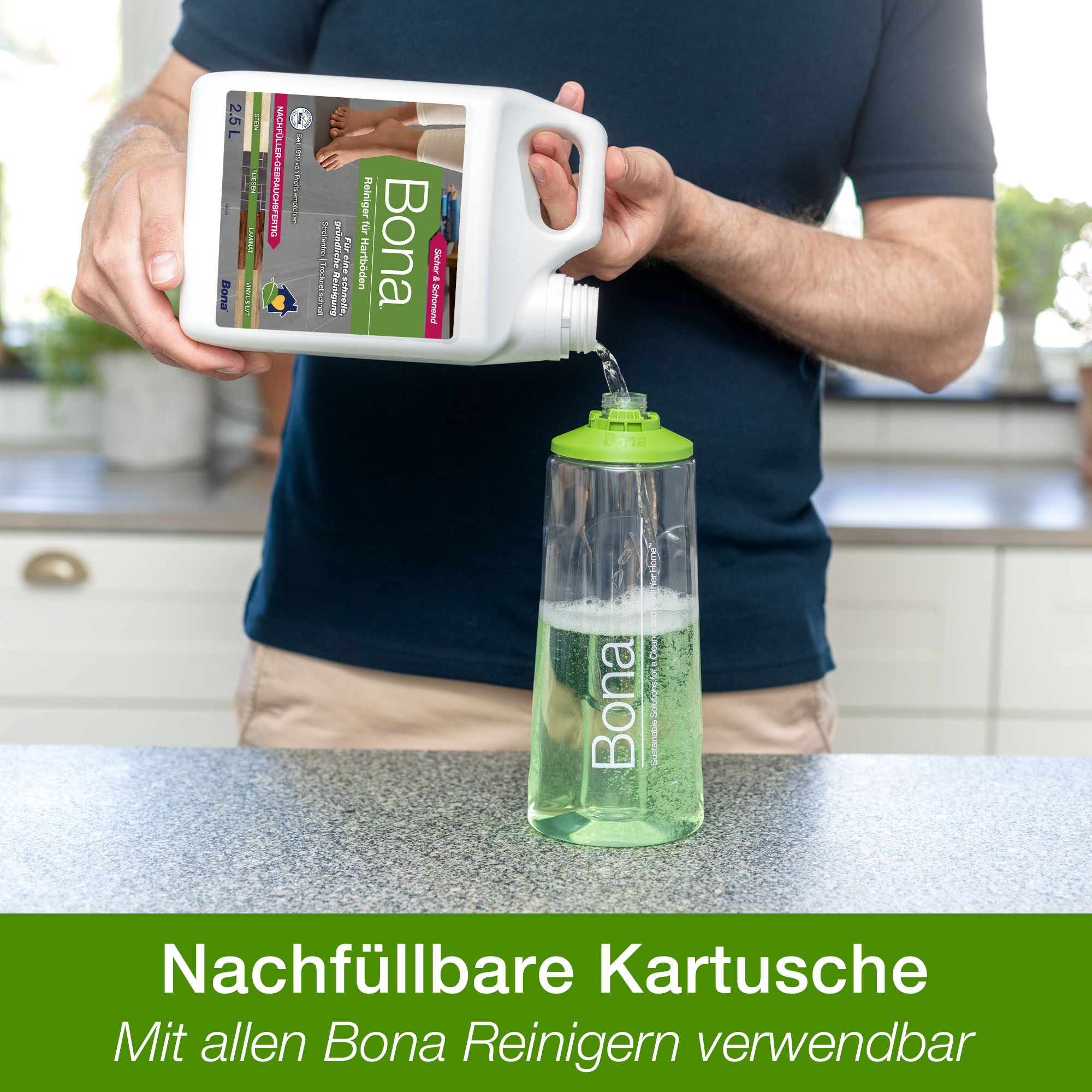 Die Bona Reiniger für Stein-, Fliesen- und Laminatböden in der Kartusche eignet sich zur Verwendung mit dem Bona Spray Mop für Stein-, Fliesen- und Laminatböden. Mit der streifenfreien Formel werden Staub, Schmutz und andere Verunreinigungen von Hartböden gründlich ohne Nachspülen entfernt.